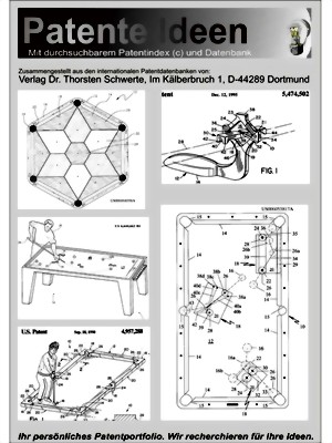 Bei der großen Vielzahl von Patentanmeldungen im Bereich Billiard sind die Spielideen für alternative Spielweisen sicher am unterhaltensten und können von jedem leicht nachgemacht werden. Ob es nun andere Tischformen sind, aufwendiges Minigolf-Billiard oder minimalisiertes Finger-Billiard, es ist sehr anregend anzuschauen und zu lesen.